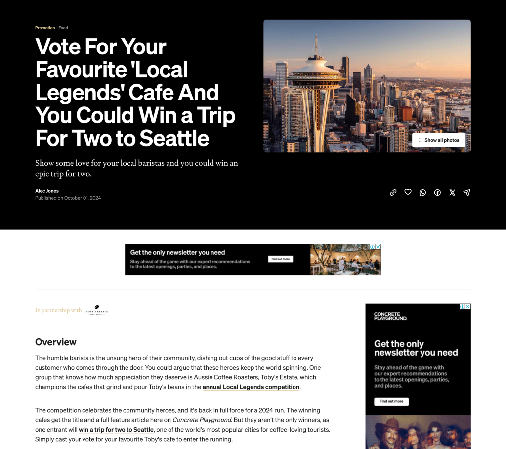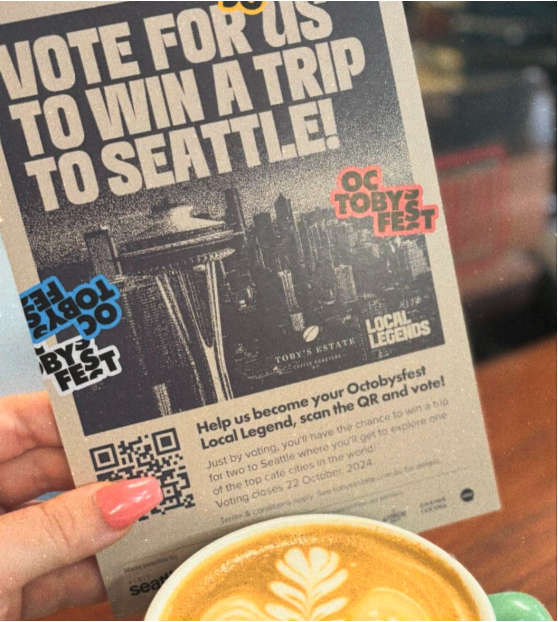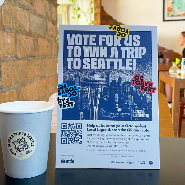 In 2024, Toby’s Estate and Visit Seattle relaunched the Octobysfest competition, offering a coffee-themed trip to Seattle as the grand prize. Customers were invited to vote for their favourite Toby’s Estate café, with each vote serving as an entry into the draw. To maximise campaign reach, Toby’s Estate invested in co-promotion, implementing a multi-channel promotional strategy. This included creating a dedicated landing page showcasing competition details and commissioning paid content on the city guide Concrete Playground plus a range of owned channel marketing initiatives. Engaging posts were shared across Toby’s Estate’s Facebook and Instagram channels, alongside an email marketing campaign. Beautifully designed in-store signage was placed at over 200 cafés across Australia to encourage participation, and stickers were added to all coffee cups sold throughout October to promote the competition further and take the campaign offline in a new way. Individual cafés also supported the campaign by sharing it on their social media channels.