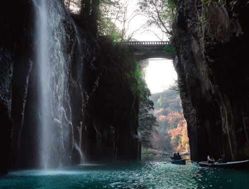 Miyazaki Prefecture’s landscapes are defined by a long stretch of coast lined with golden beaches and spectacular rock formations. With temperate weather and great surfing, the Nichinan Coast is a popular getaway. Miyazaki is considered a home of the gods, with ancient legends told through Kagura dance. Dense forests, dramatic gorges and hidden mountain villages take you back to those storied times. One of Miyazaki, and in fact, all of Japan’s most famous sites is the spectacular Takachiho Gorge. Formed over 100,000 years ago after eruptions from nearby volcano Mt. Aso, the gorge’s 80-100 metre-high basalt cliffs line a chasm, just 3 metres wide at its narrowest point and the gorge’s lush upper canopy is awash with vivid greenery in early summer and red-tinted leaves in autumn.